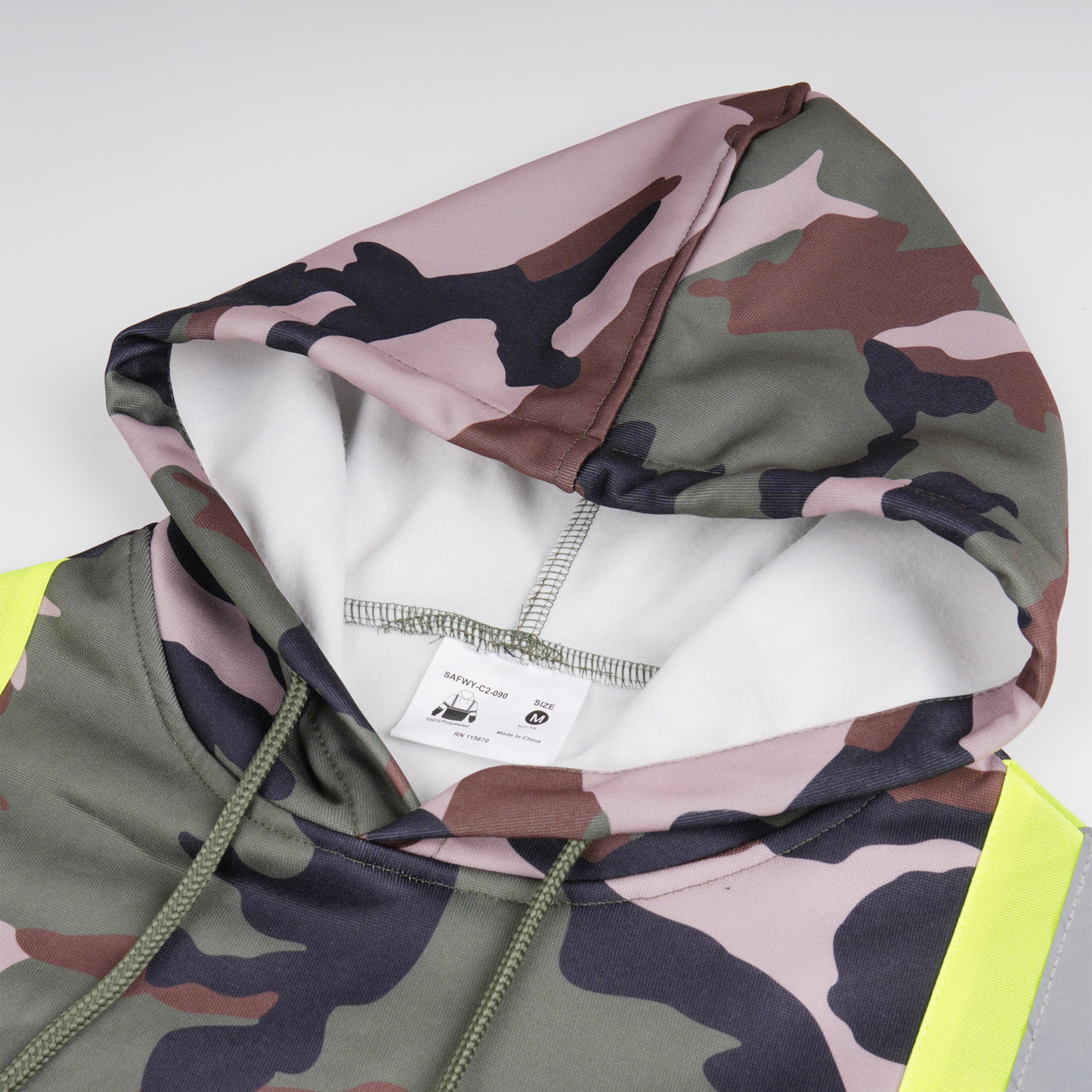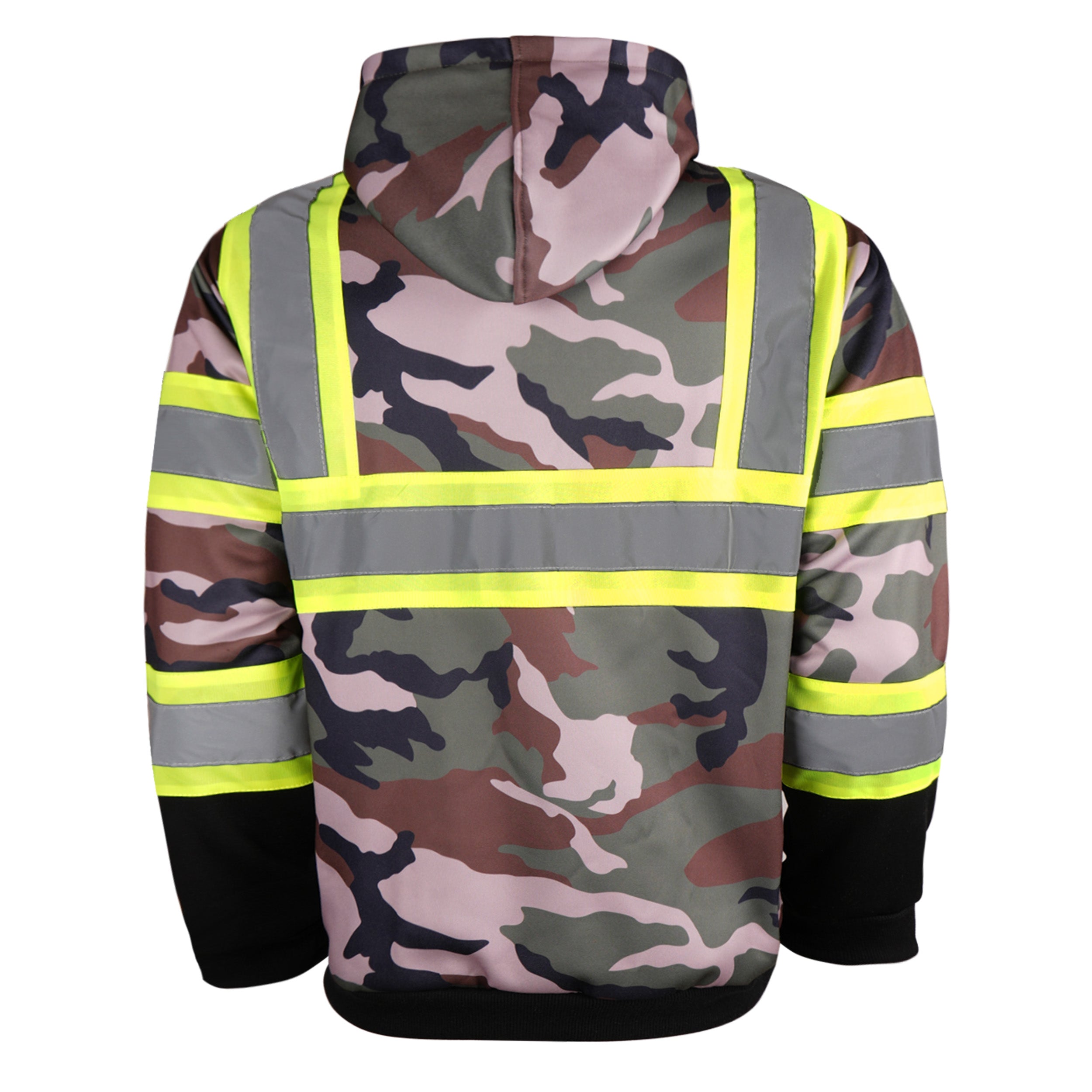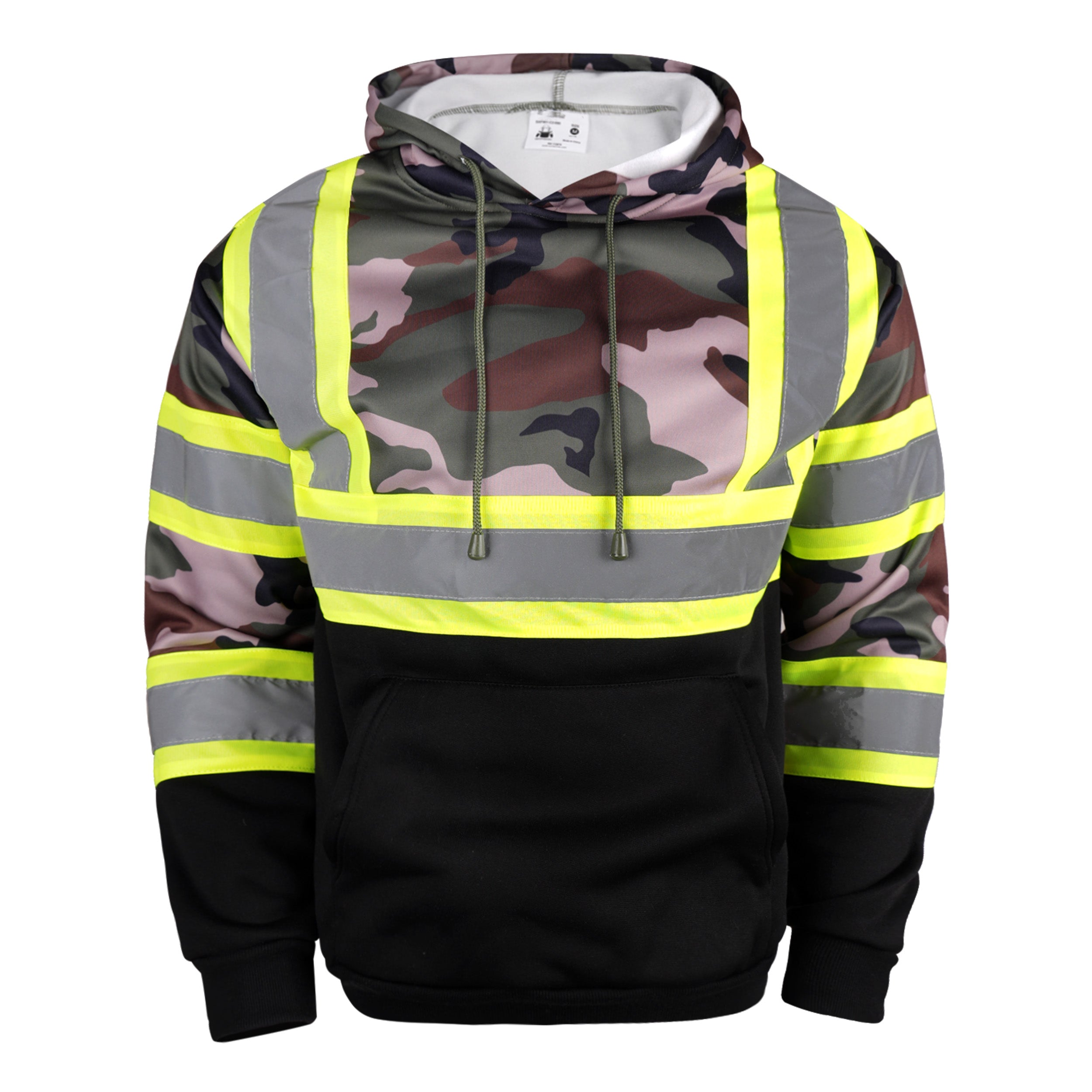Stay comfortable and visible with the Color Block Camo Pullover Hoodie. Crafted from 100% polyester, this hoodie combines durability and style. The top half features a classic camouflage design, while the bottom half is sleek black, creating a bold color-blocked look. Reflective stripes add enhanced visibility for low-light conditions, and the front kangaroo pocket provides easy storage and warmth. Perfect for workwear or casual outings.