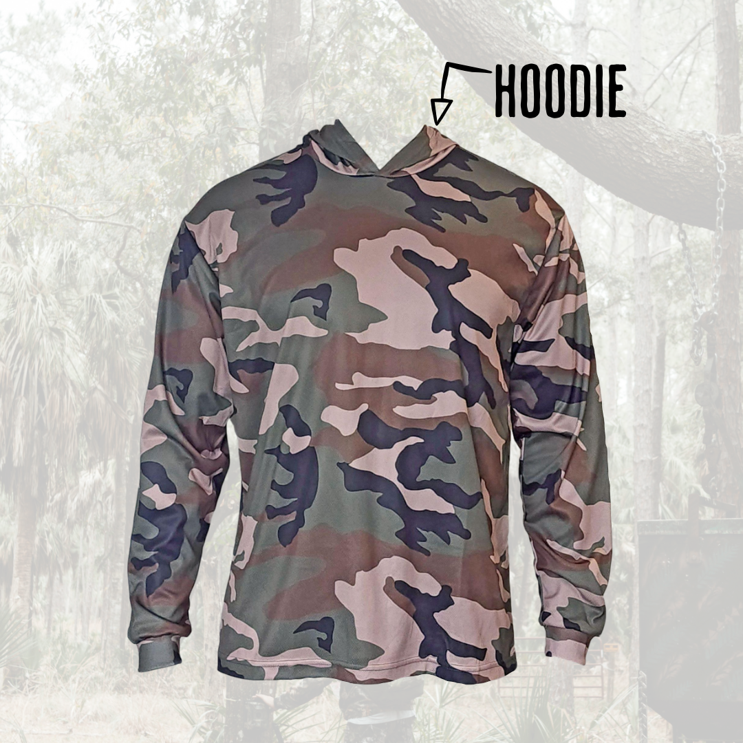 Stay concealed and protected with this long sleeve hunting camo hooded tee. Made from 100% polyester, this moisture-wicking shirt keeps you dry in the field. The built-in hood offers extra coverage for hunting, fishing, and outdoor work. Featuring an all-over camouflage print, this lightweight yet durable tee is perfect for layering or wearing on its own during early mornings and cool weather hunts.